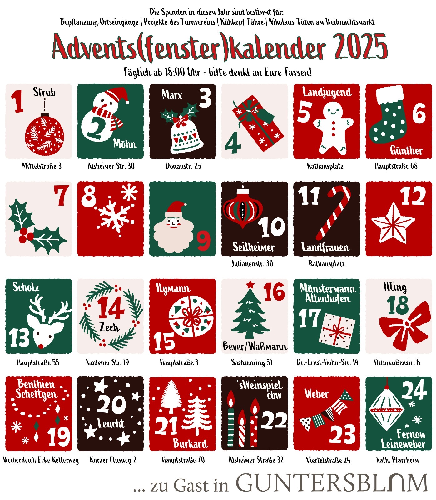Guntersblumer Adventsfenster, immer um 18:00 Uhr. Bitte Tasse mitbringen!