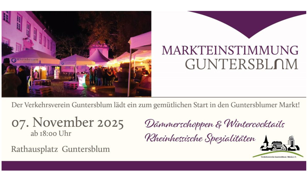 Zum Start in den Guntersblumer Markt lädt der Verkehrsverein Guntersblum am Freitag, den 07. November 2025 wieder ein zur Markteinstimmung. Die Veranstaltung findet ab 18.00 Uhr auf dem stimmungsvoll ausgeleuchteten Rathausplatz statt. Die Besucher erwartet unter dem Pagodenzelt ein Dämmerschoppen mit Wein und Wintercocktails, dazu Bratwurst im Brötchen oder typisch rheinhessisch: Pellkartoffele mit Lewwerworscht oder mit waasche Kees. Der Eintritt ist wie immer frei. Weiteres unter: www.verkehrsverein-guntersblum.de.