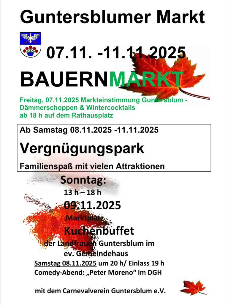 Der Markt am Samstag, den 08. November 2025 beginnt mit dem Kampagnenstart des Carneval-Vereins Guntersblum und seinem Comedy-Abend mit Peter Moreno (Bauch Comedy). Der dreifache Weltrekordhalter im Bauchreden präsentiert sein erfolgreiches und unvergessliches Soloprogramm „BauchComedy“ mit Comedy und viel Humor aus dem Bauch heraus! Sein Motto: „Lachen ist Programm!“ Erleben Sie Peter Moreno live und genießen Sie eine intensive Massage Ihrer Lachmuskeln!